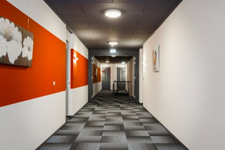 De kunstwerken op de wanden zijn zorgvuldig gekozen en afgestemd op het kleurenpalet per verdieping. De compositie en kleurstelling versterken de gekozen streep per etage, waardoor bewoners en bezoekers telkens weer een harmonieus en verrassend beeld ervaren wanneer ze de verdieping betreden.