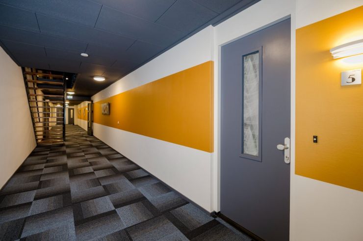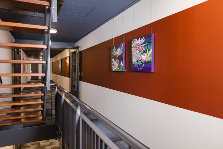 De kunstwerken op de wanden zijn zorgvuldig gekozen en afgestemd op het kleurenpalet per verdieping. De compositie en kleurstelling versterken de gekozen streep per etage, waardoor bewoners en bezoekers telkens weer een harmonieus en verrassend beeld ervaren wanneer ze de verdieping betreden.
