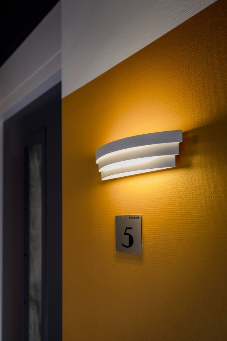 Eén van de meest opvallende elementen in het ontwerp? De statement wall (de muur die je direct ziet wanneer je de trap opkomt) en horizontale streep op elke verdieping.